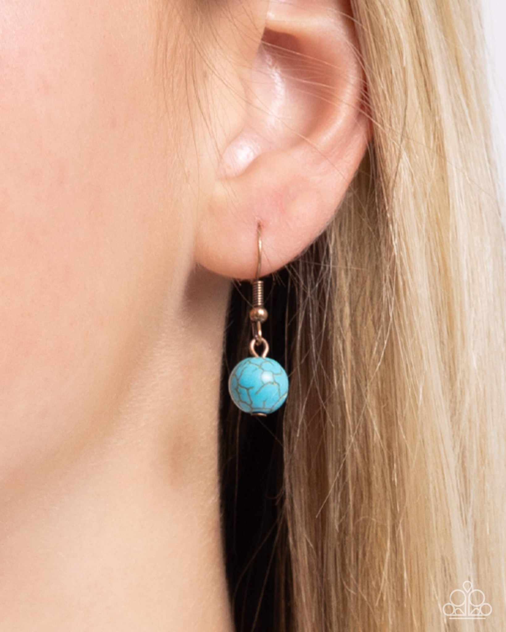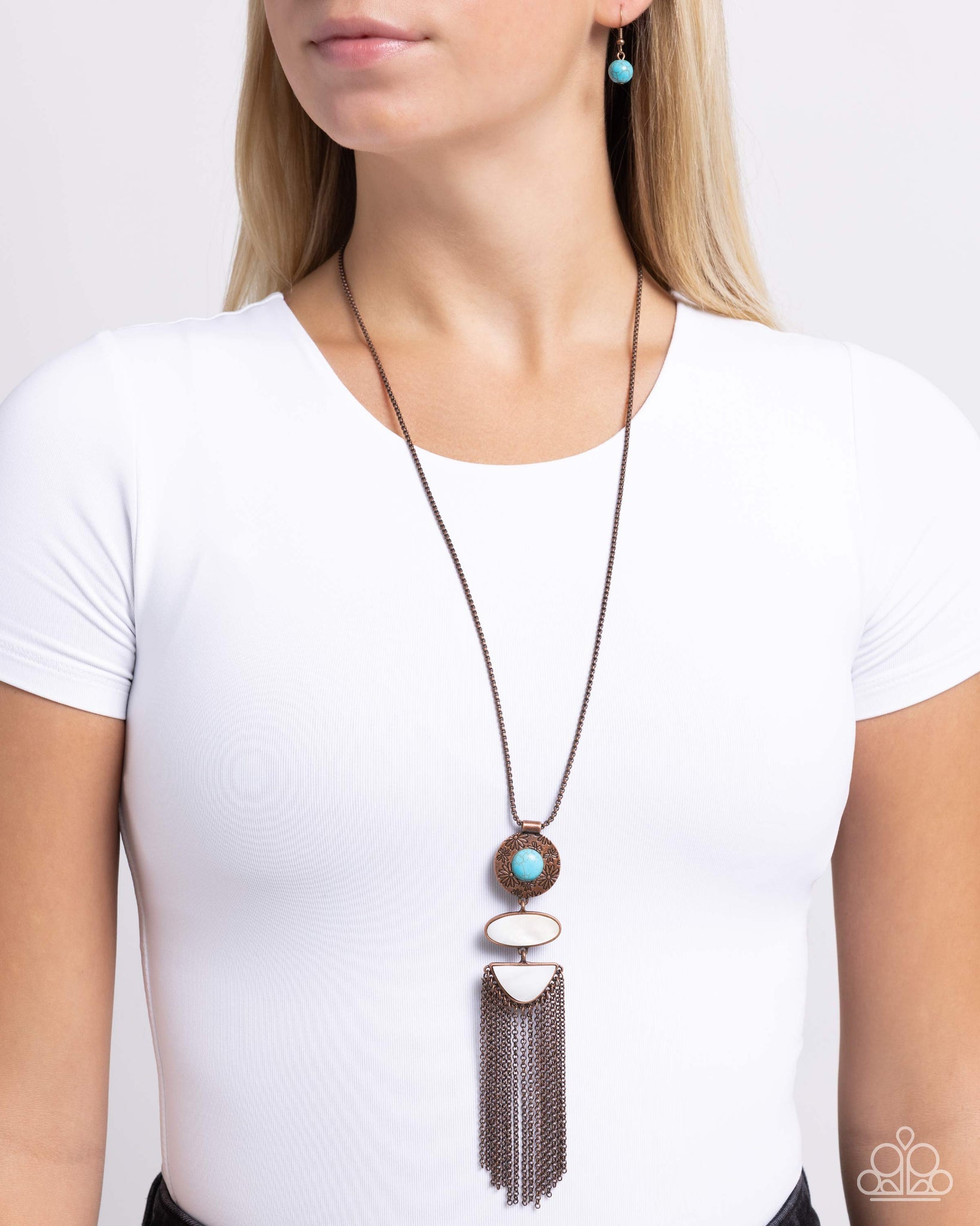 Stamped in a daisy motif, a copper disc with a turquoise stone center glides along a rounded copper box chain, giving way to a white shell in an oval copper fitting, which gives way to an upside-down arched white stone. A tapered tassel of copper chains charismatically sways from the bottom of the design for an eye-catching finish. Features an adjustable clasp closure. As the stone elements in this piece are natural, some color variation is normal.