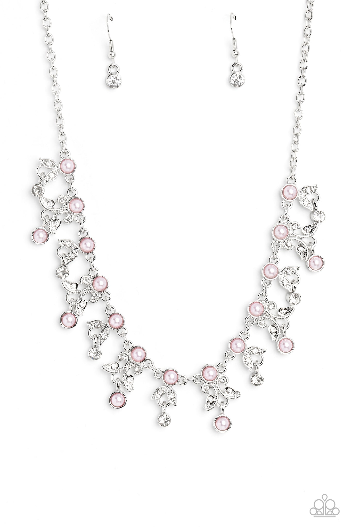 Infused along a classic silver chain, a row of light pink pearls, pressed into silver frames, stands out against the collar for a touch of refinement. Dangling below the row of light pink pearls, a shimmery collection of leaf-like filigree and detailing, studded with dainty white rhinestones and silver studs, adds a botanical element to the elegant display. Crystal-like white gems and light pink pearls encased in silver frames, dangle below every other botanical charm, rounding out the design with whimsical movement. Features an adjustable clasp closure.