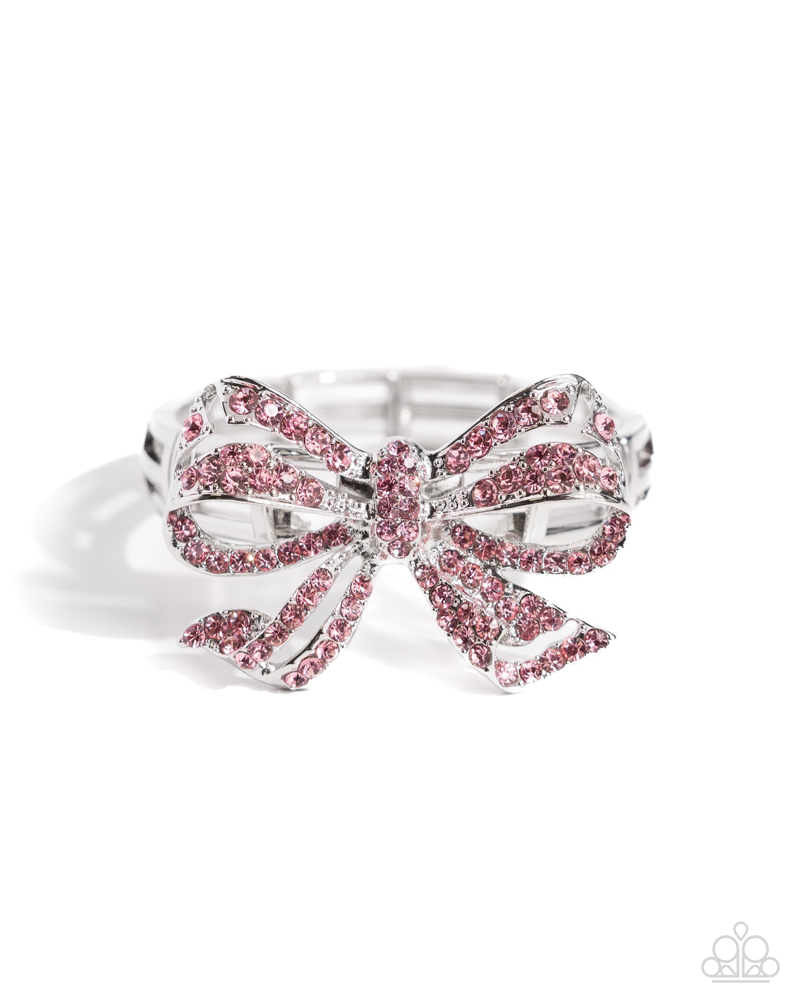 Infused along elastic stretchy bands, airy silver frames gleam along the wrist for a monochromatic display. Encrusted in light rose rhinestones, an oversized, airy silver bow glitters at the center of the design for a touch of class and refinement.