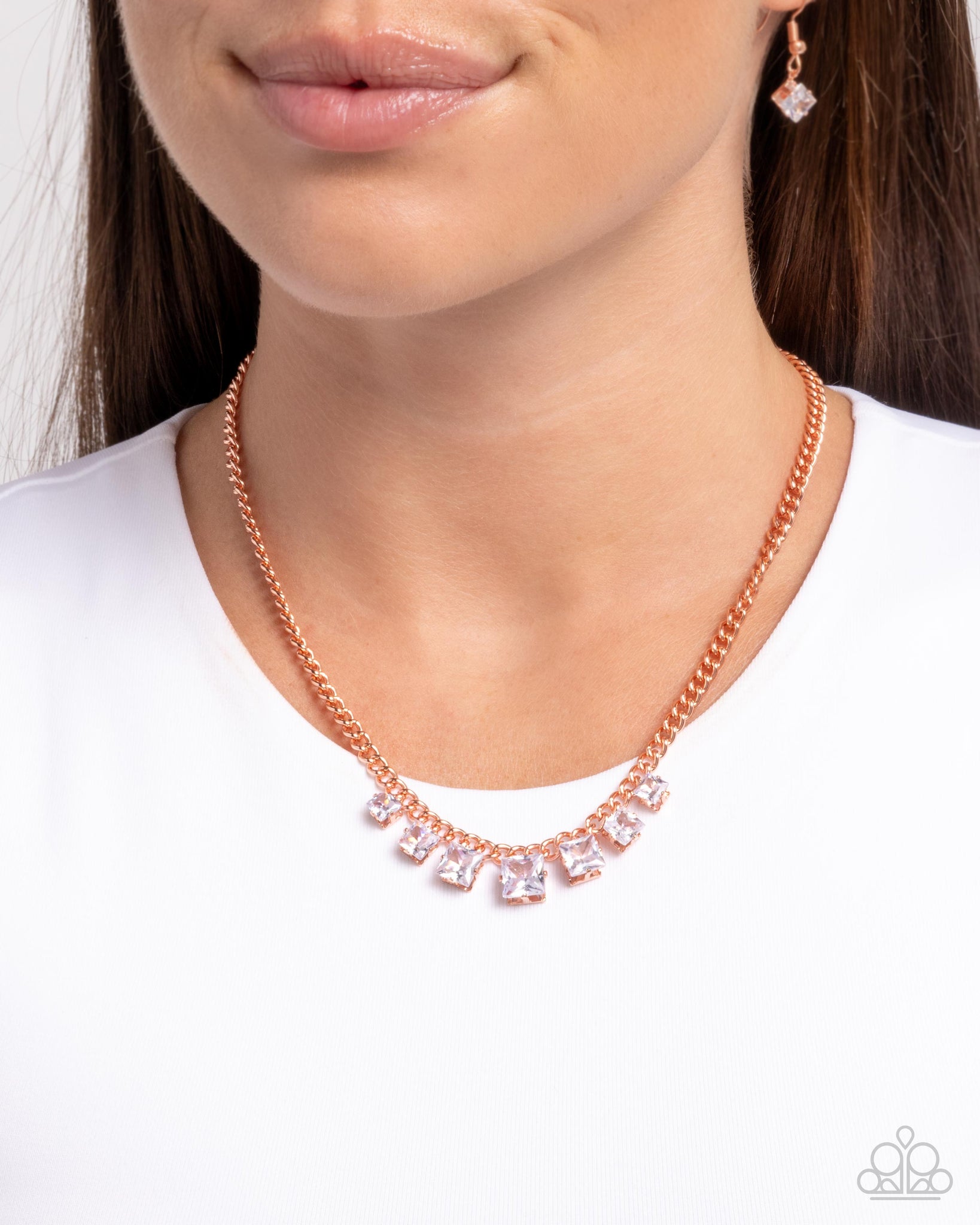 Pressed in elevated shiny copper fittings, faceted white square gems are sporadically sprinkled along a shiny copper curb chain, gradually increasing in size along the center of the neckline, adding a dramatic, dauntless flash of glitz. Features an adjustable clasp closure.