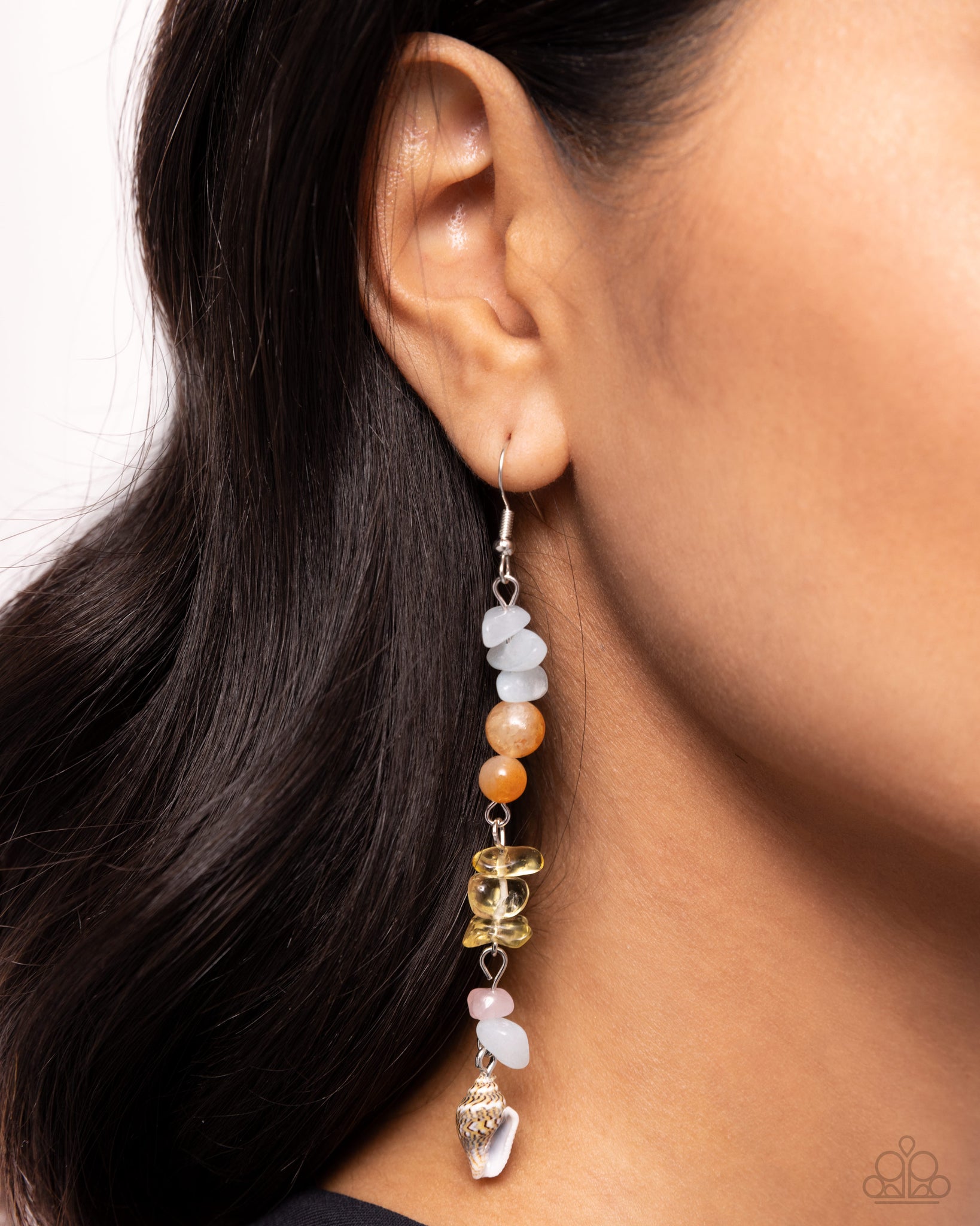 Various chiseled and round stones featuring various opacities link in a free-spirited pattern down the ear, leading the eye down to a patterned seashell charm at its end for a beach-inspired lure. Earring attaches to a standard fishhook fitting. As the stone elements in this piece are natural, some color variation is normal.
