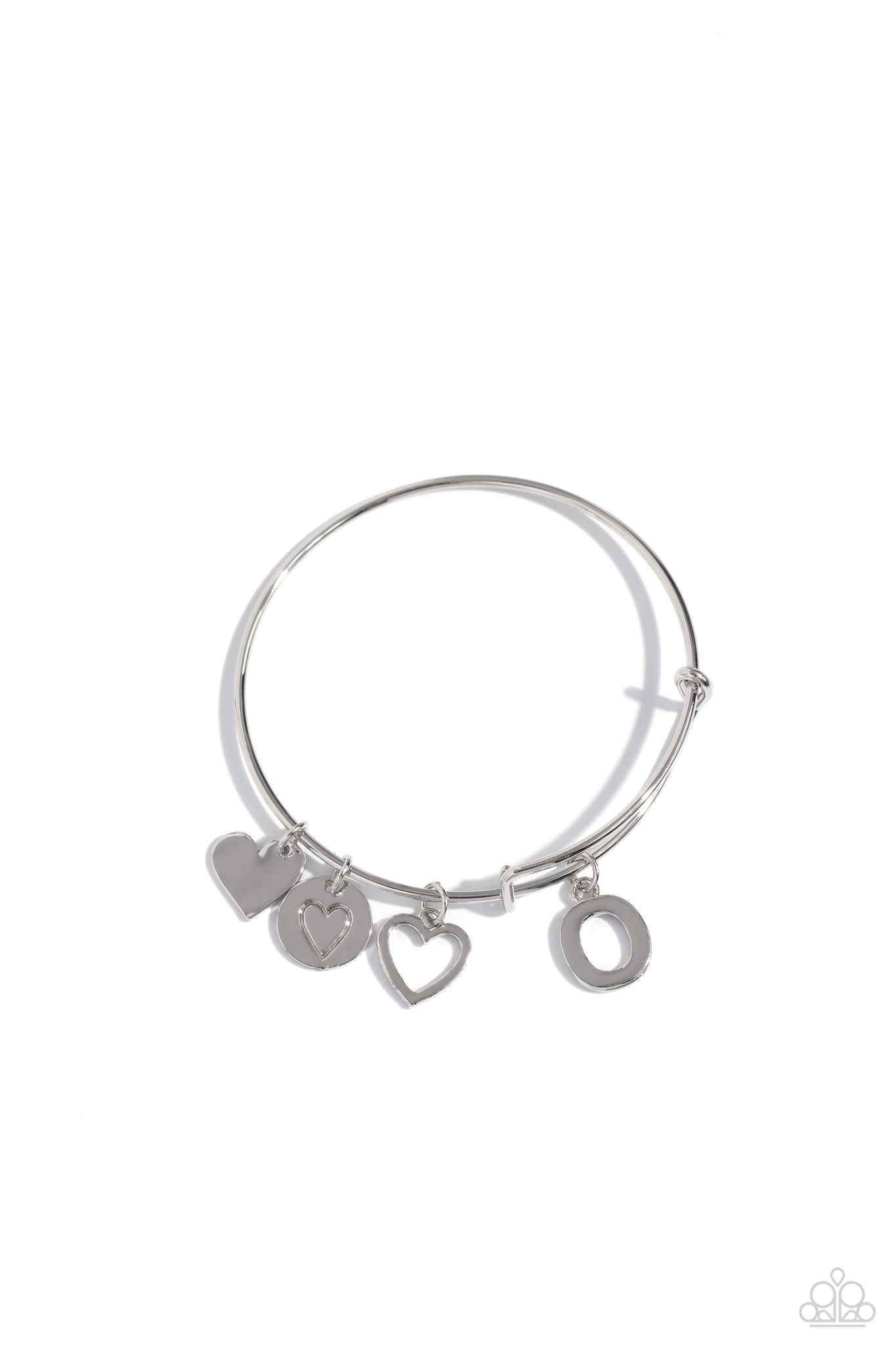 Featuring shiny silver, airy, and stamped finishes, a mismatched collection of dainty heart charms, and the letter "O" glides along a silver bar fitting at the center of the wrist for a romantic, sentimental flair.