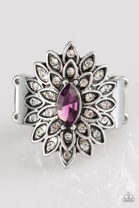 Dotted in dainty white rhinestones, silver petals radiate from a regal purple marquise shaped rhinestone center for an edgy look. Features a stretchy band for a flexible fit.