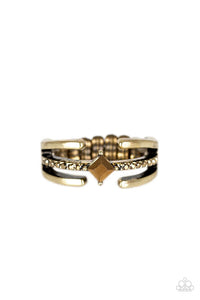 Glistening brass bars gather around a sparkling aurum rhinestone encrusted band. Featuring a regal square cut, a aurum rhinestone is pressed into the center for an edgy finish. Features a dainty stretchy band for a flexible fit.