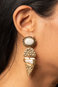 Dotted with oval and triangular white stone accents, mismatched gold frames alternate with hammered geometric gold plates, creating an elegantly earthy lure. Earring attaches to a standard post fitting.
