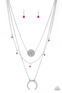A silver floral frame swings from the uppermost chain, above a strand of faceted pink beads swinging from a shimmery silver chain. A silver crescent frame swings from the lowermost chain, creating whimsical layers down the chest. Features an adjustable clasp closure.