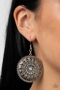 Mandala-like petals layer and fan out from a dainty blue opal rhinestone center, blooming into an enchanting floral frame. Earring attaches to a standard fishhook fitting.