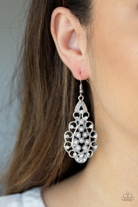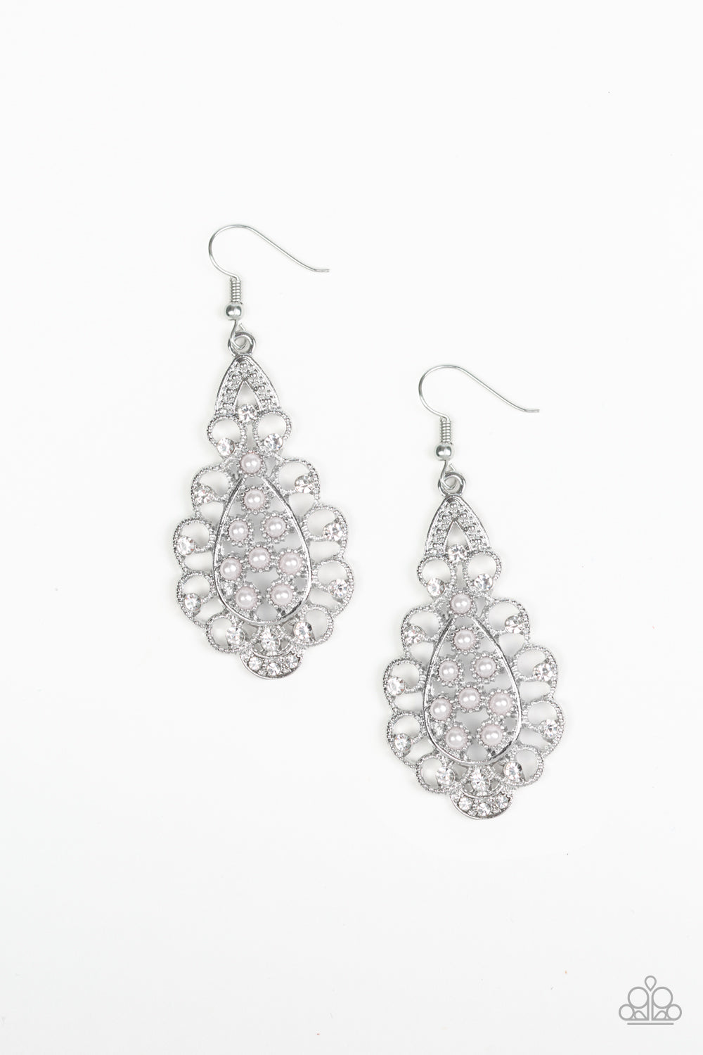 Dotted with glassy white rhinestones, elegant silver filigree curls around a white pearl dotted center for a regal look. Earring attaches to a standard fishhook fitting.
