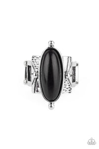 An oval black stone is nestled inside a studded silver fitting that sits atop a decorative silver frame stamped in tribal inspired textures, creating a rustic centerpiece. Features a stretchy band for a flexible fit.